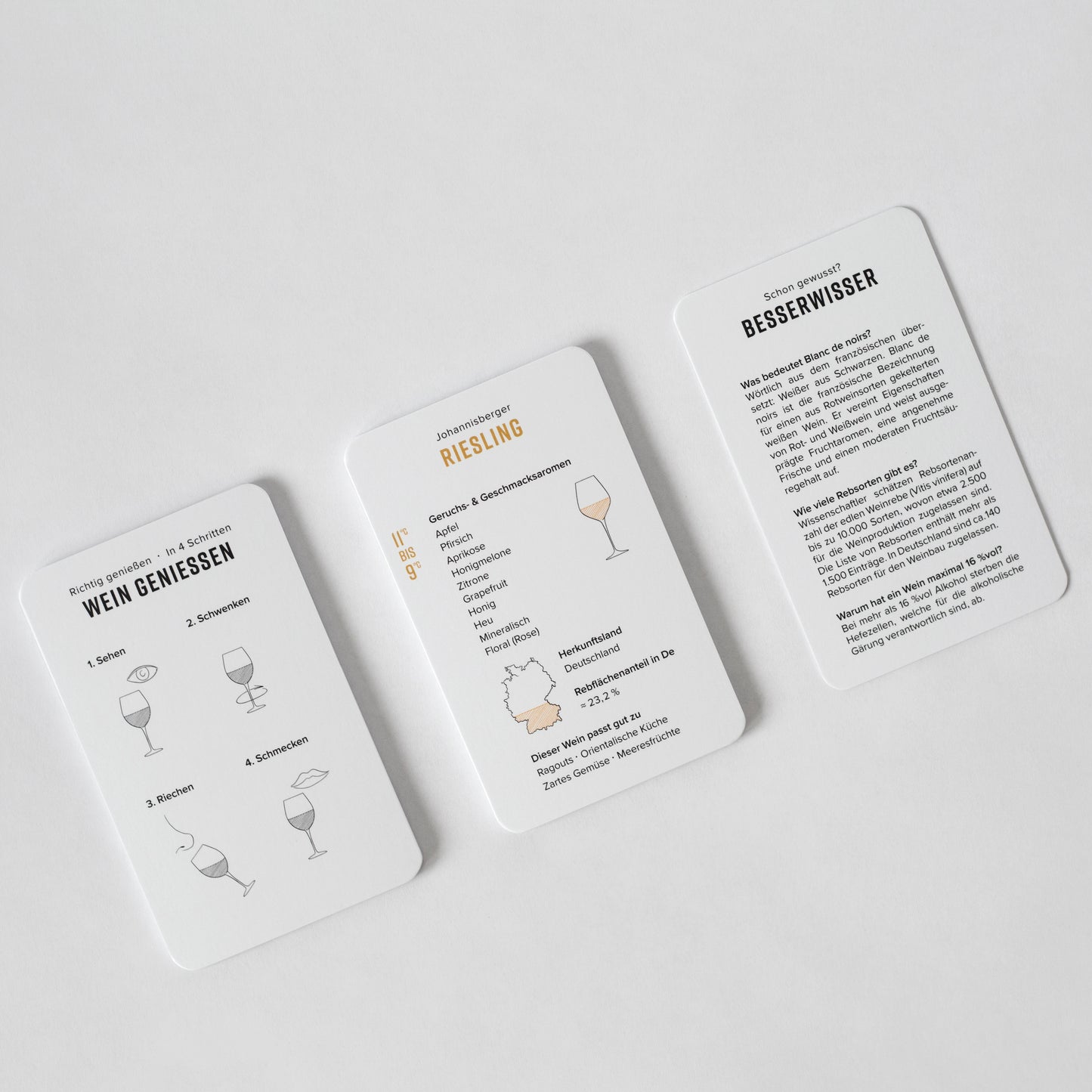 Dieses Kartenset enthält 52 Seiten Weinwissen auf den Rebsortenkarten, Wissenskarten und Besserwisserkarten sowie eine Anleitung für das Versanstalten Deiner Weinverkostung, inklusive 50 Verkostungskarten zum Ausfüllen.